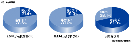 効果判定基準に基づき評価を行った有効率は、2.5MU/kg投与群で71.4%、1MU/kg投与群で65.5%となり、ともに対照群と比較して有意に高く、インターキャット®投与による治療効果が認められました。