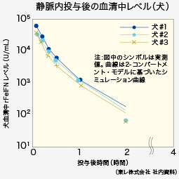 ビーグル犬3頭にインターキャット® 5MU/kgを静脈内投与したところ、投与5分後の血清中濃度は4.0×104±8×103U/mL、投与2時間後には150±20U/mLに減少し、投与4時間後には検出限界以下となりました。分布相である初期相の半減期は3.1±0.1分、代謝・排泄相である後期相の半減期は15.0±0.6分でした。